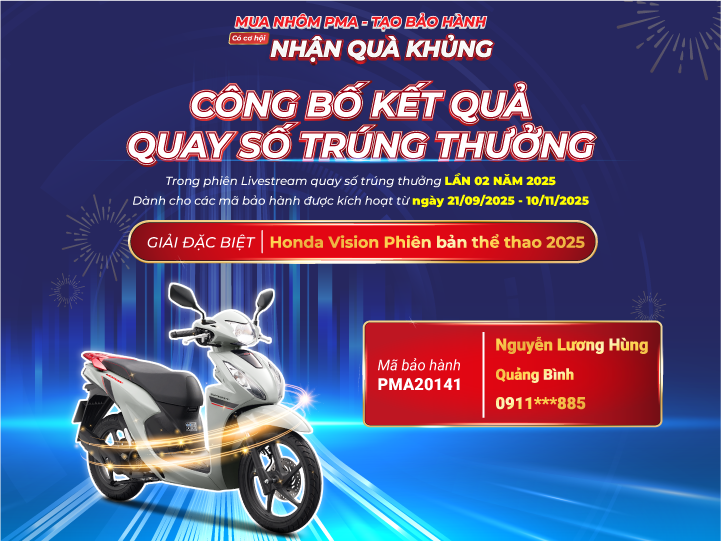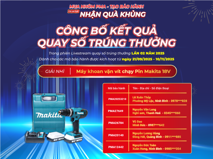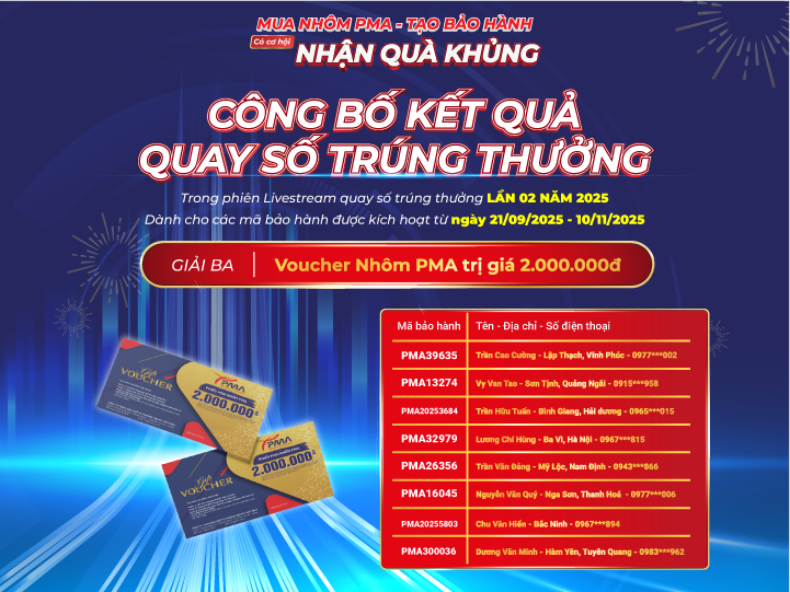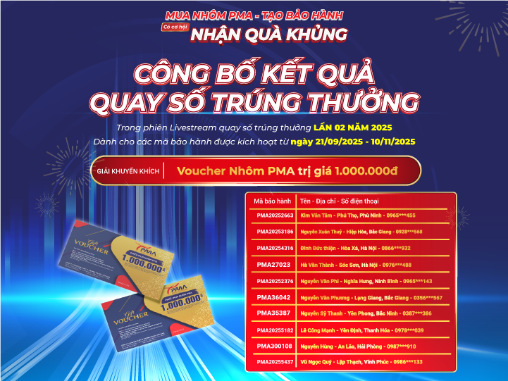 Nhôm PMA xin gửi lời cảm ơn chân thành đến toàn thể Quý khách hàng và đối tác đã đồng hành. Hãy tiếp tục kích hoạt bảo hành và theo dõi Fanpage, Website chính thức của Nhôm PMA để không bỏ lỡ cơ hội nhận nhiều phần quà hấp dẫn trong những vòng quay tiếp theo.