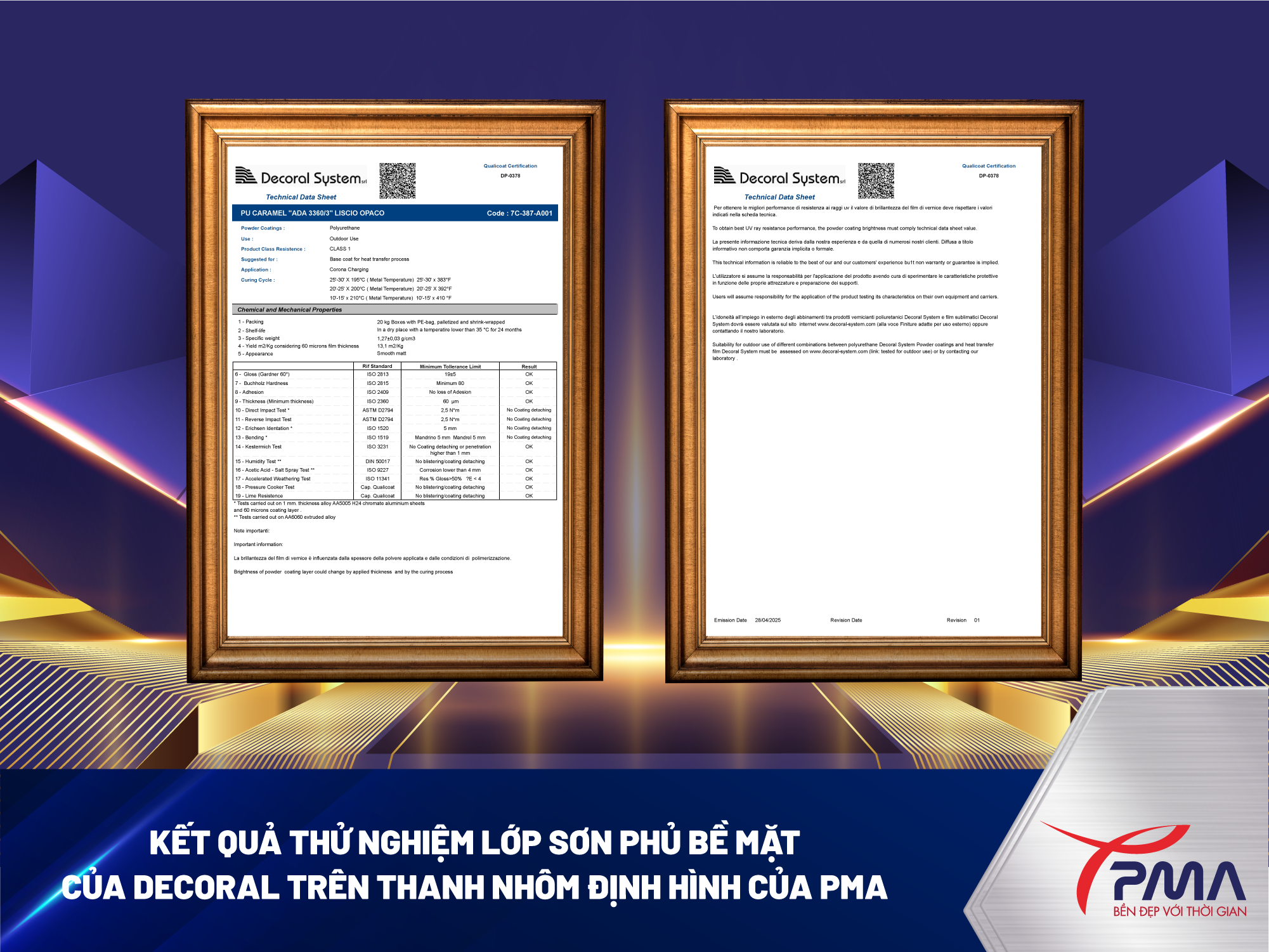 Sau quá trình kiểm chứng toàn diện, đến cuối năm 2025, tiêu chuẩn chất lượng sơn phủ bề mặt của Nhôm PMA đã chính thức được Decoral cấp chứng nhận, xác nhận đủ điều kiện để triển khai chính sách bảo hành 10 năm cho màu vân gỗ trắc.