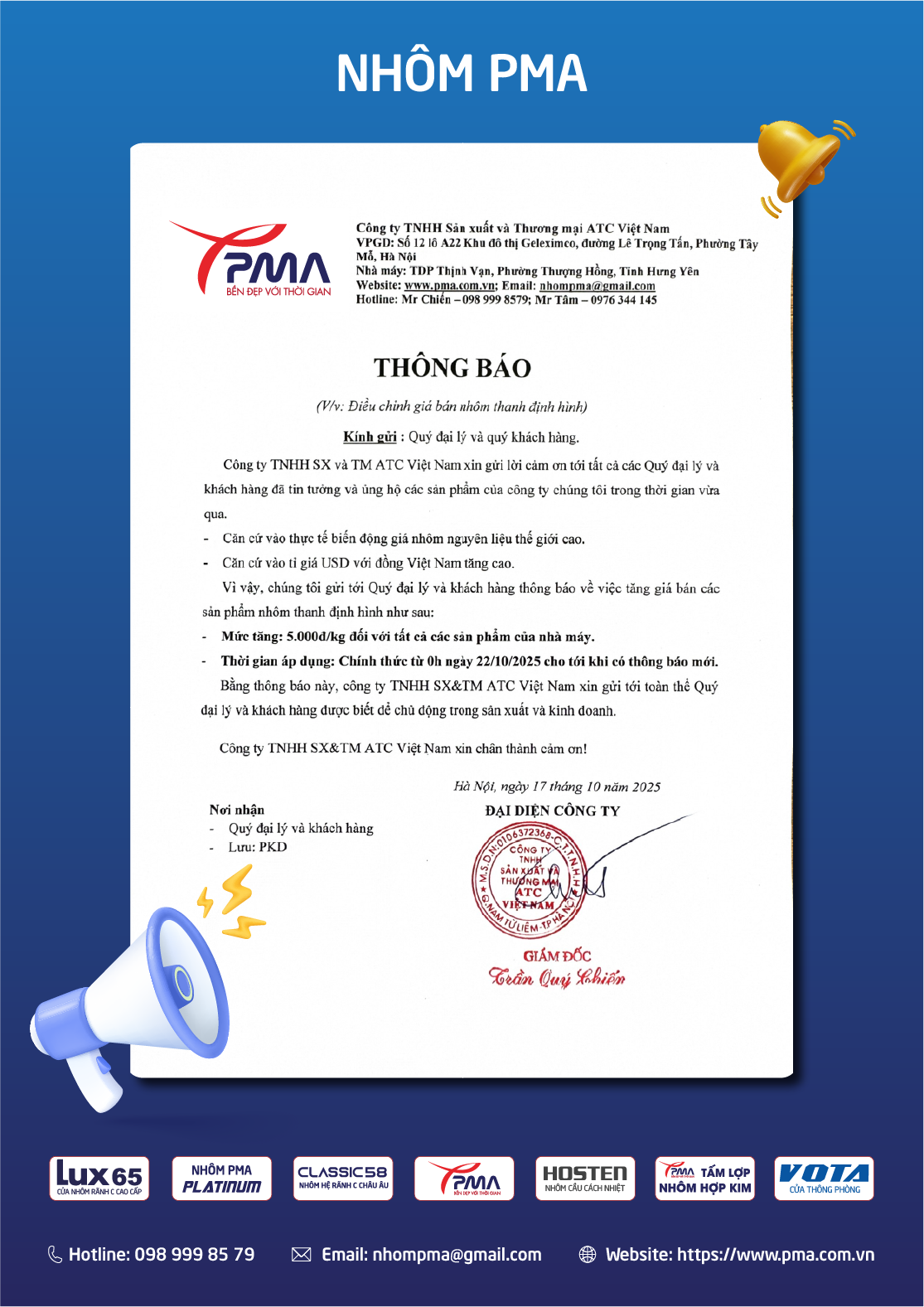 Công ty TNHH Sản xuất và Thương mại ATC Việt Nam (Nhôm PMA) xin trân trọng gửi lời cảm ơn chân thành đến Quý Đại lý, Quý Khách hàng đã luôn tin tưởng, đồng hành và ủng hộ các sản phẩm của PMA trong suốt thời gian qua.
