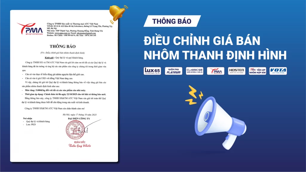 Trước những biến động của giá nhôm nguyên liệu trên thị trường thế giới cùng tỷ giá USD tăng cao, để đảm bảo chất lượng sản phẩm và duy trì hoạt động sản xuất ổn định, Nhôm PMA xin thông báo về việc điều chỉnh giá bán các sản phẩm nhôm thanh định hình như sau: